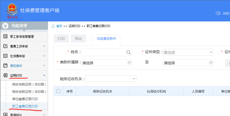 第三步【證明(míng)打印】—【職工(g≥ ōng)繳費(fèi)證明(míng)開(kāi)具】;